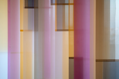 Henriëtte Santing creates site-specific, dynamic and spatial designs of transparent, artificial silk. It is a composition of vertical blinds, the slats react with the light and with each other. One piece includes multiple compositions, due the turning of the slats, on both sides.