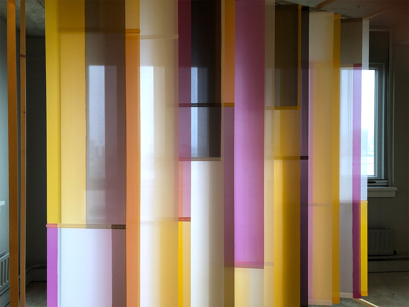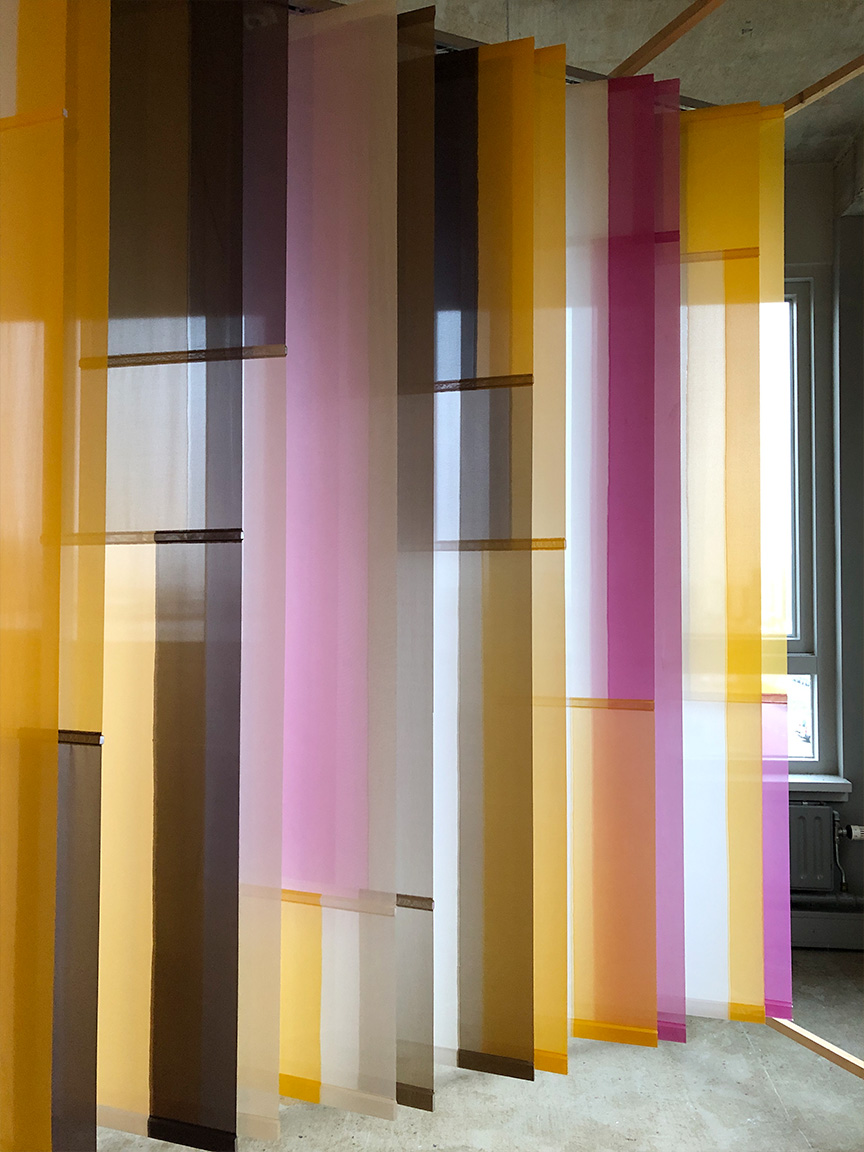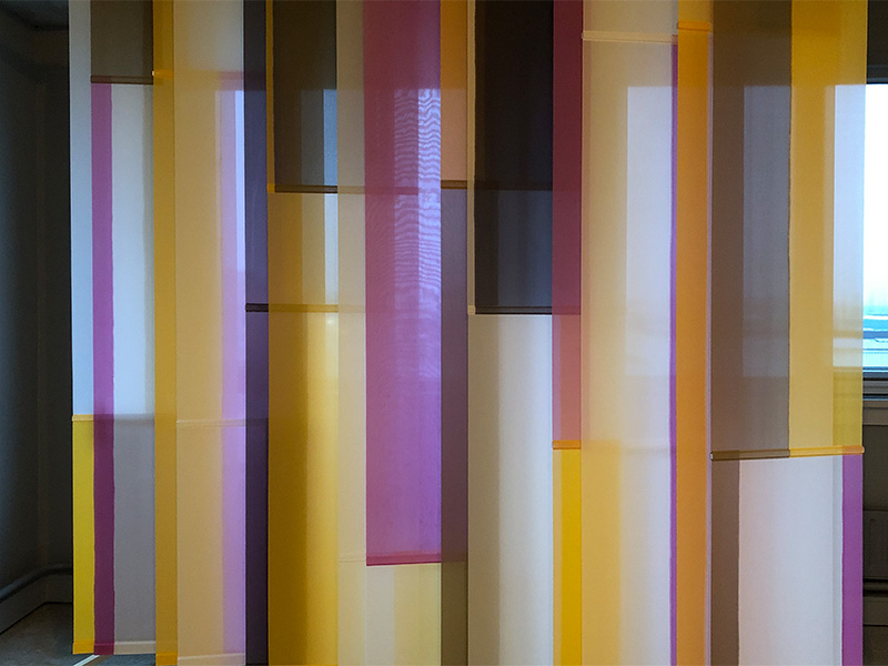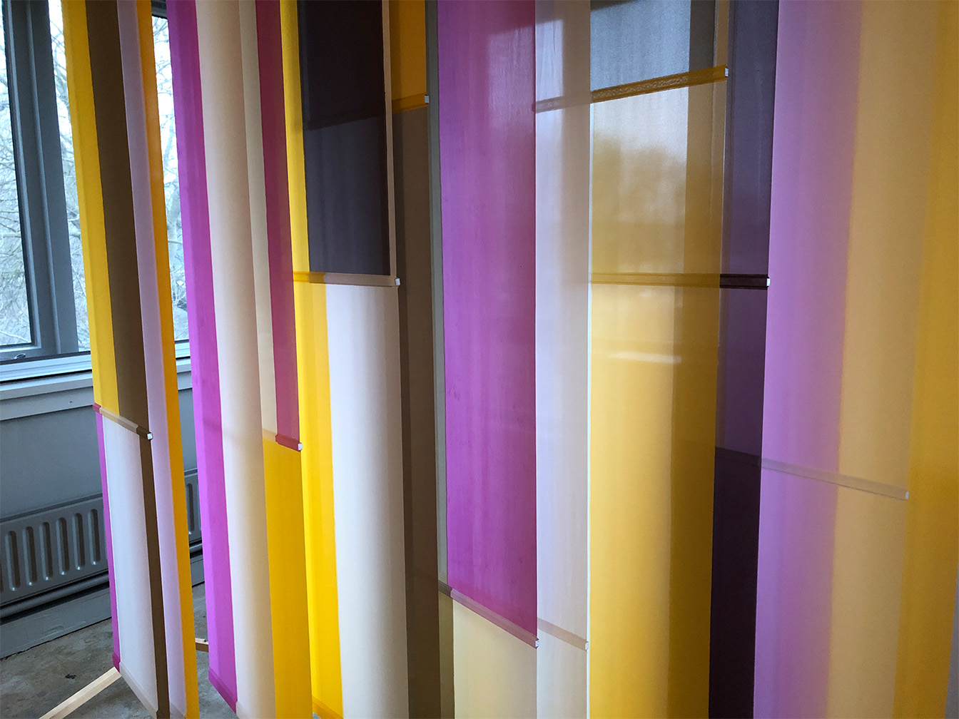 Sample for a room divider, 2026. – Slats can be turned, UV-resistent. Material: artificial silk, acrylics (paint, medium, additive, varnish), fitting. Blinds seen with daylight backlight and artificial normal light in winter late afternoon. Size: w250 x h220 x d44 cm.