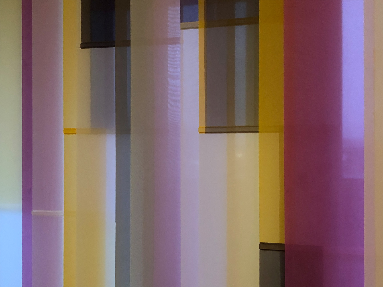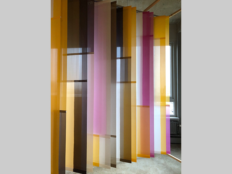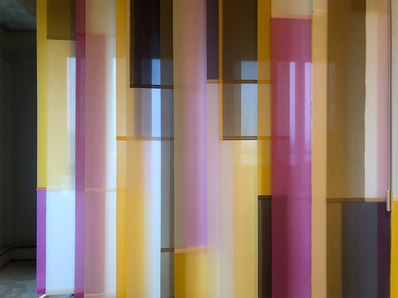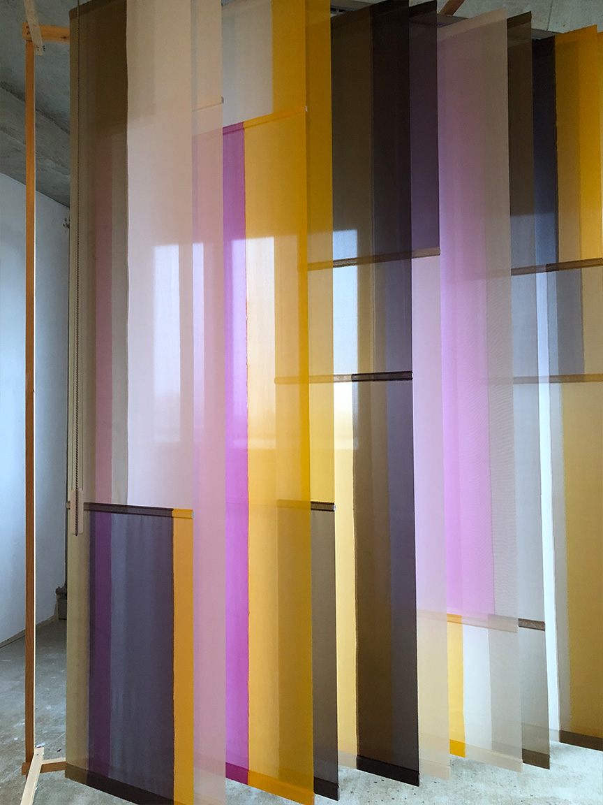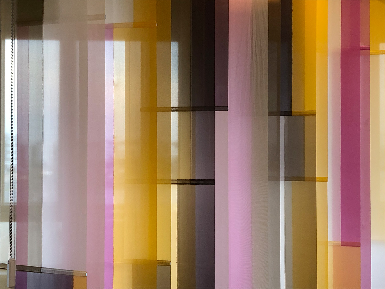 Sample for a room divider, 2026. – Slats can be turned, UV-resistent. Material: artificial silk, acrylics (paint, medium, additive, varnish), fitting. Blinds seen with daylight backlight and artificial normal light in winter late afternoon. Size: w250 x h220 x d44 cm.