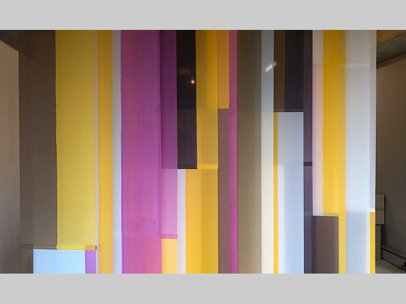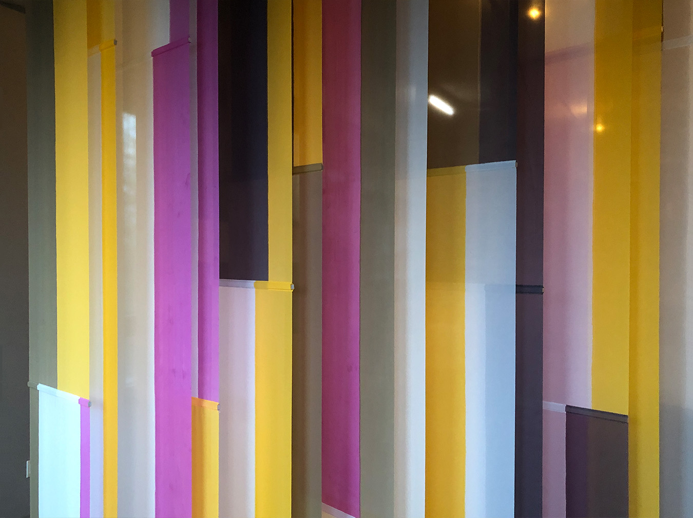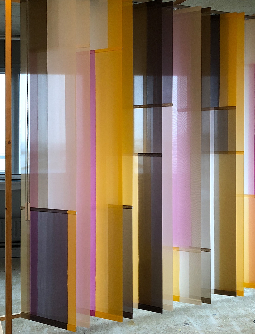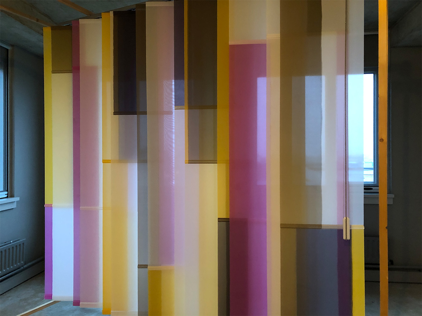 Sample for a room divider, 2026. – Slats can be turned, UV-resistent. Material: artificial silk, acrylics (paint, medium, additive, varnish), fitting. Blinds seen with daylight backlight and artificial normal light in winter late afternoon. Size: w250 x h220 x d44 cm.
