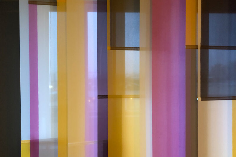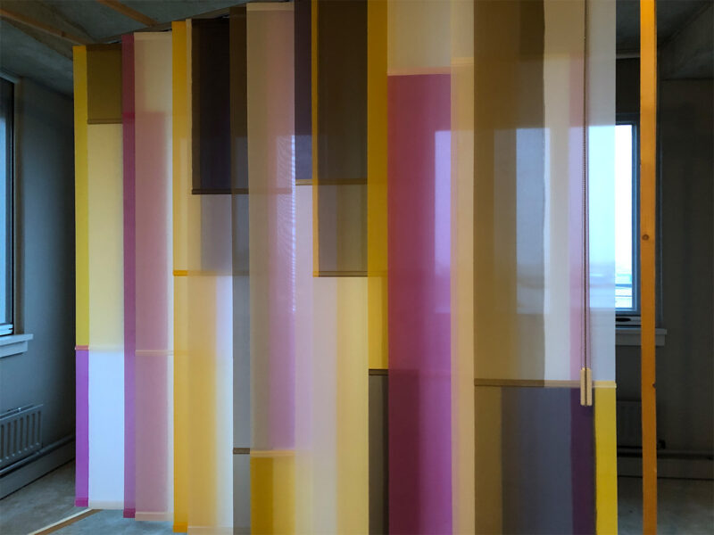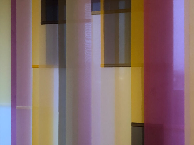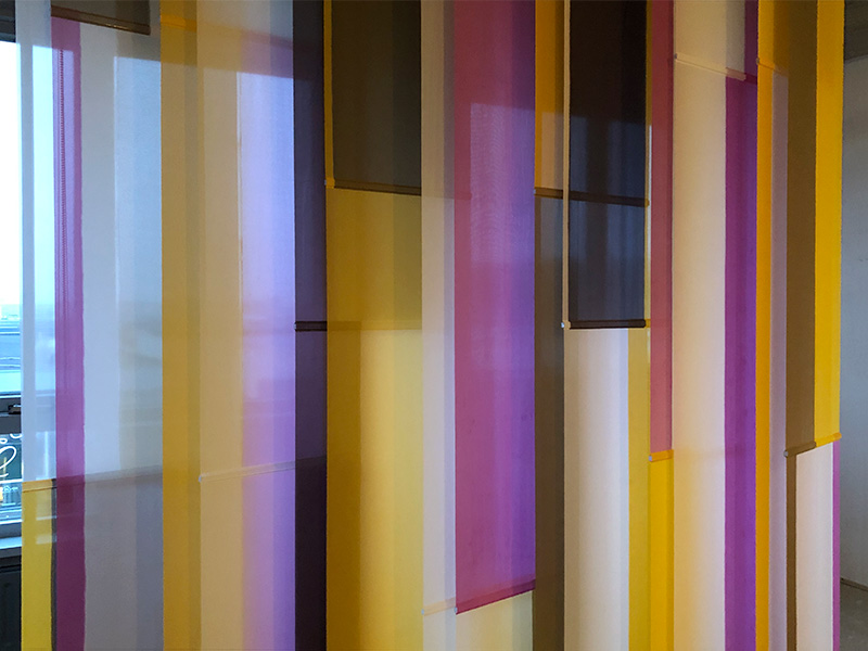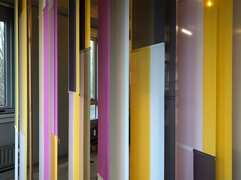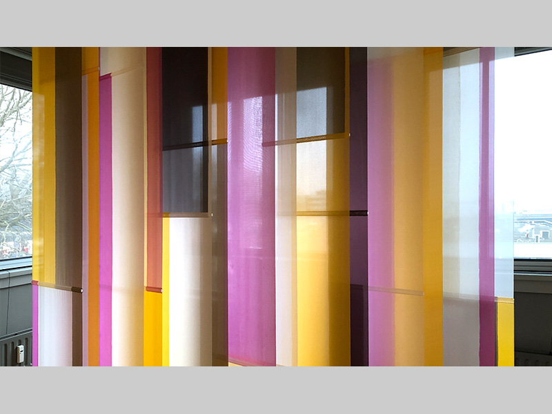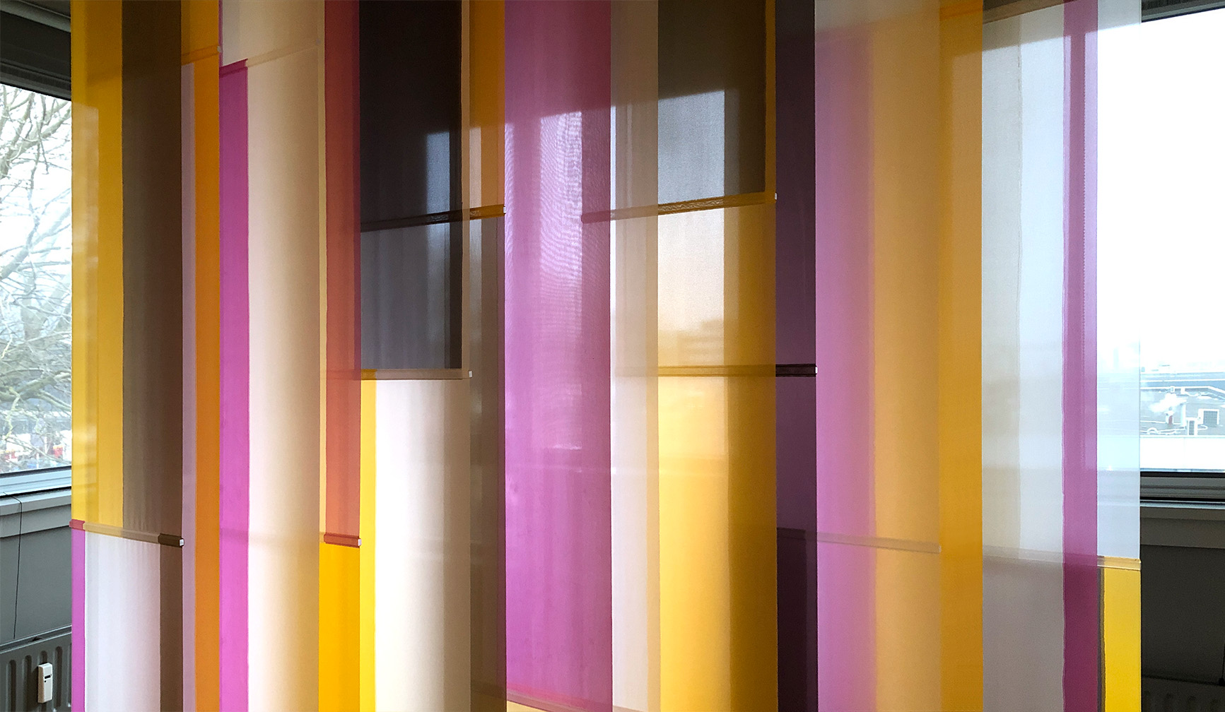 Sample voor een roomdivider, 2026. – Lamellen kantelbaar, UV-resistent. Materiaal: kunstzijde (polyester), acrylics (verf, mediums, additieven, vernis), ophangsysteem. Verticale jaloezie gezien met daglicht tegenlicht en erop vallend kunstlicht in winter namiddag. Maat: b250 x h220 x d44 cm.