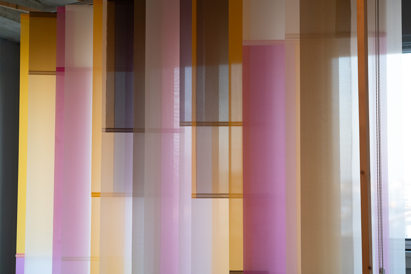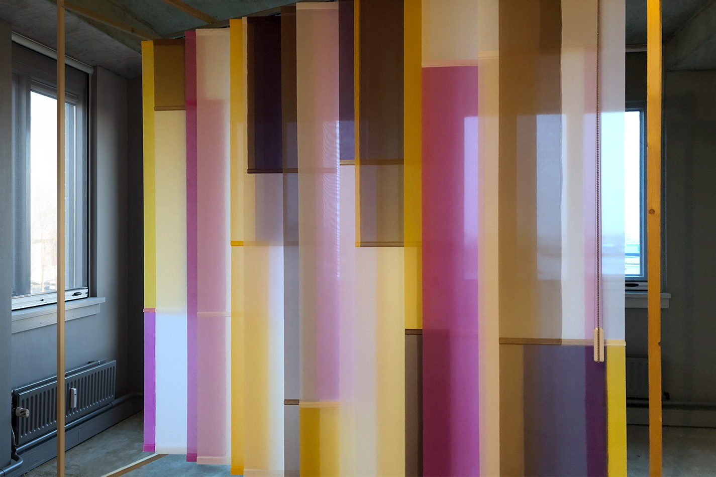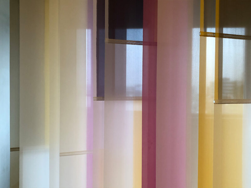 Sample voor een roomdivider, 2026. – Gezien met daglicht tegenlicht en erop vallend kunstlicht op diverse wintermiddagen in het atelier. De kleur is afhankelijk van de dekkingsgraad en deze is weer afhankelijk van de sterkte van het daglicht tegenlicht in verhouding tot het kunstlicht uit de ruimte. Ook bepaalt de hoek vanuit waar je kijkt de transparantie. De verticale jaloezie hangt in een houten werkframe, zodat ik het kan verplaatsen en draaien. Lamellen zijn kantelbaar en UV-resistent. Materiaal: kunstzijde (polyester), acrylics (verf, mediums, additieven, vernis), ophangsysteem. Maat: b250 x h220 x d44 cm.