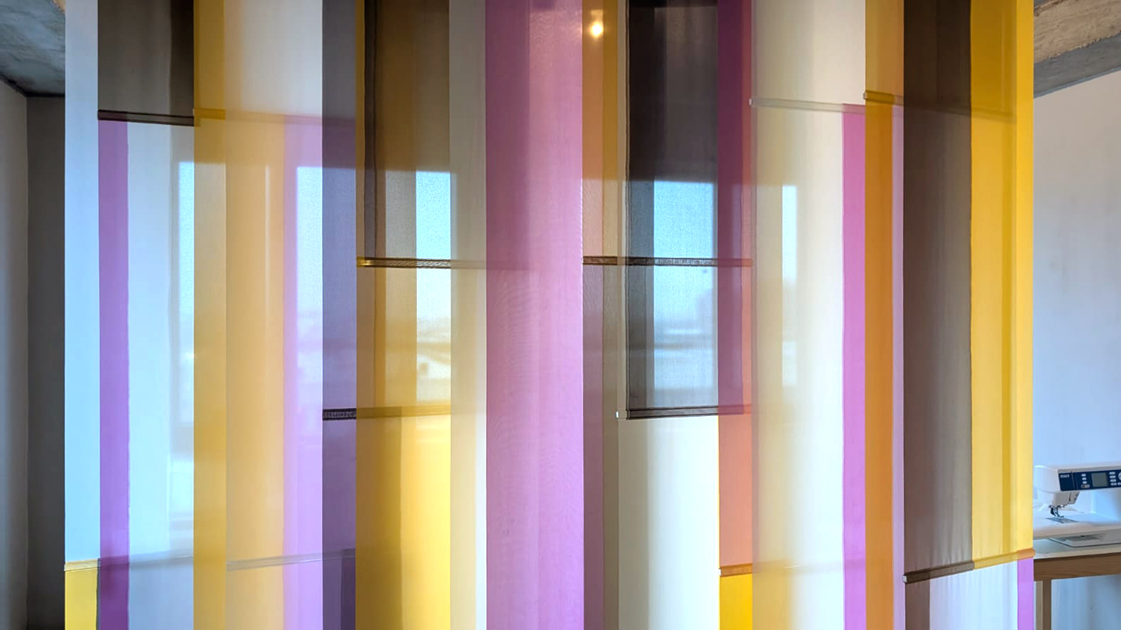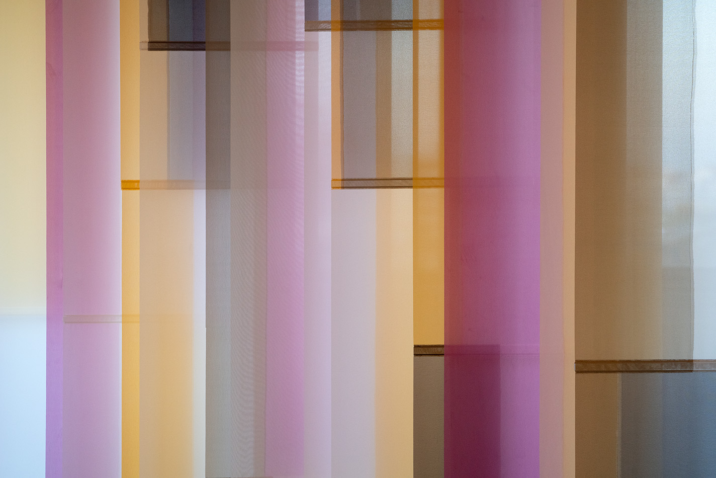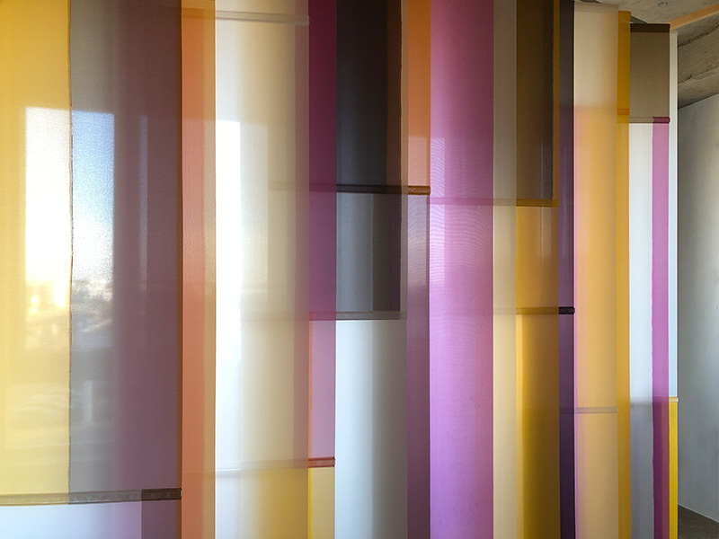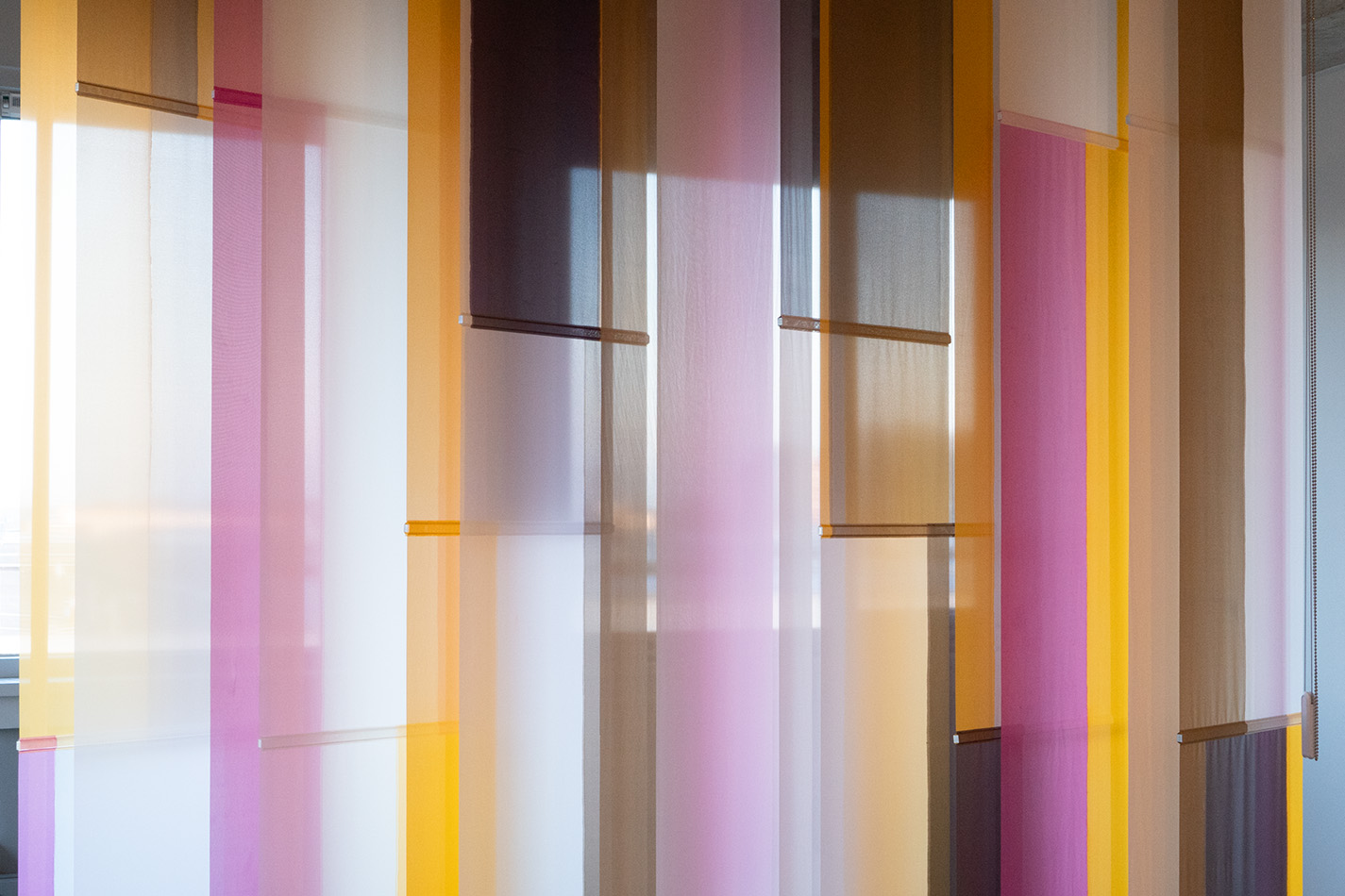 Sample voor een roomdivider, 2026. – Gezien met daglicht tegenlicht en erop vallend kunstlicht op diverse wintermiddagen in het atelier. De kleur is afhankelijk van de dekkingsgraad en deze is weer afhankelijk van de sterkte van het daglicht tegenlicht in verhouding tot het kunstlicht uit de ruimte. Ook bepaalt de hoek vanuit waar je kijkt de transparantie. De verticale jaloezie hangt in een houten werkframe, zodat ik het kan verplaatsen en draaien. Lamellen zijn kantelbaar en UV-resistent. Materiaal: kunstzijde (polyester), acrylics (verf, mediums, additieven, vernis), ophangsysteem. Maat: b250 x h220 x d44 cm.