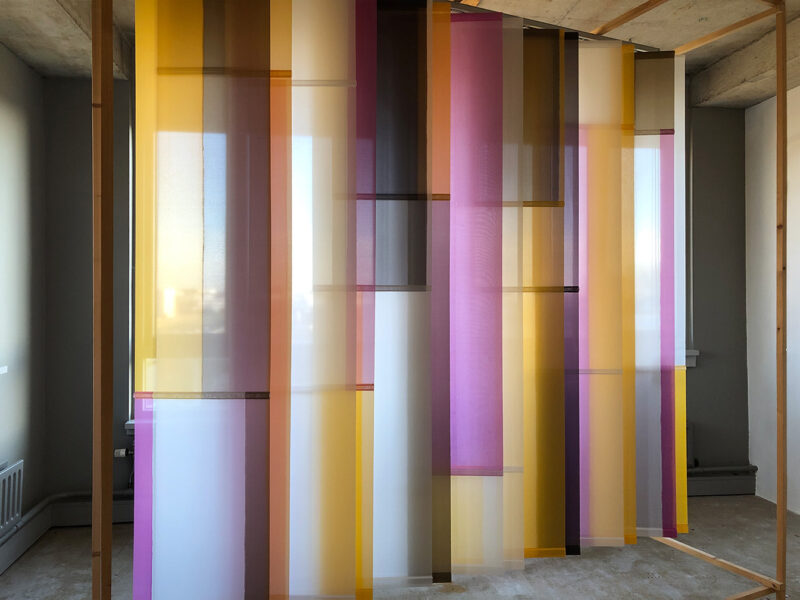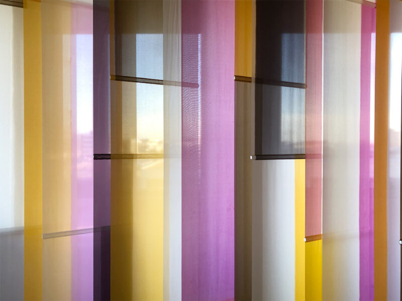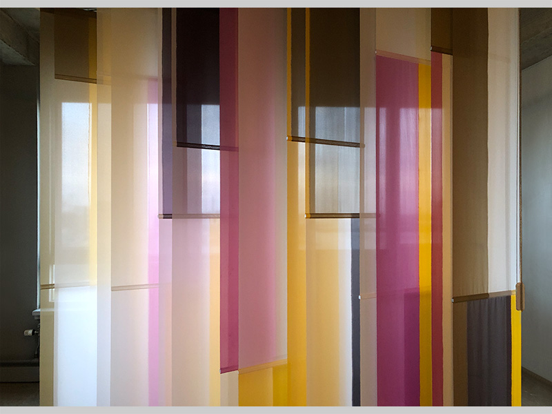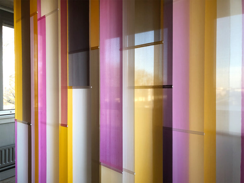 Sample for a room divider, 2026. – Seen with daylight backlight and artificial normal light on several winter afternoons in the studio. The color depends on the opacity, which in turn depends on the strength of the daylight backlight relative to the artificial light in the room. The viewing angle also determines the transparency/opacity. The vertical blind hangs in a wooden work frame, so I can move and turn it. The slats can be turned over and are UV-resistant. Material: artificial silk, acrylics (paint, medium, additive, varnish), fitting. Size: w250 x h220 x d44 cm.